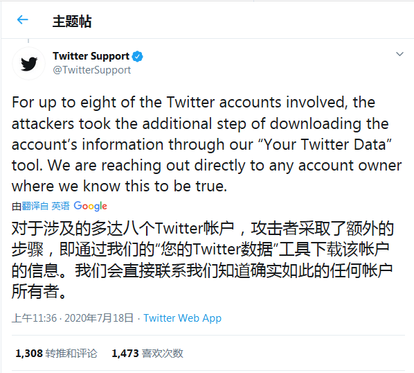 而在被黑客攻击的至少 8 个推特账号中,黑客采用了额外的步骤--通过“Your Twitter Data”工具下载了该账户的信息,目前推特已经联系了该账号的所有者采用紧急补救措施。