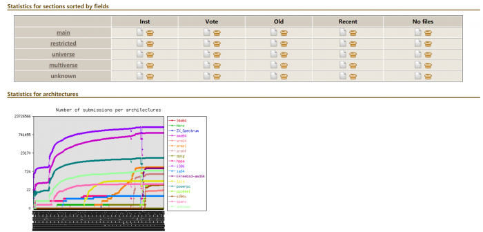 Popcon 每周发送一次已安装软件包的列表以及相关文件的访问时间。服务器每天都会将结果匿名化,然后在 Popcon 站点 发布调查数据。统计内容包括:使用软件包的人数、经常使用的人数、已安装但不常使用的人数、近期有升级的人数等等。
