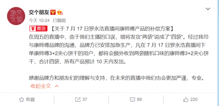 7月19日消息,交个朋友公布“7月17日罗永浩直播间康师傅产品的补偿方案”。据悉,在7月17日的直播活动中,由于主播口误错将发货“两袋”说成了“四袋”。经过交个朋友与康师傅品牌的沟通,品牌方已安排加急生产,凡在7月17日罗永浩直播间下单康师傅3+2夹心饼干的用户都将会额外收到两袋随机口味的康师傅3+2夹心饼干,合计四袋,所有产品预计10天内发出。