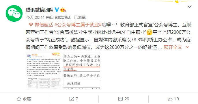 对比来看,目前,微信平台上已经拥有超过 2000 万个公众号,并且在最新的国家政策中,"公众号博主" 也属于就业,因此公众号也转正成功。