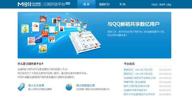 早在 2011 年,QQ 邮箱订阅就提供了开放平台(其地址为 open.mail.qq.com),并开放申请,站长可把网站加入其中,增加网站推广新渠道。