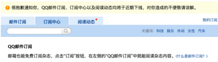 如果你最近登录 QQ 邮箱,应该会看到这样一条公告:很抱歉通知你,QQ 邮件订阅、订阅中心以及阅读动态均将于近期下线,对你造成的不便敬请谅解。这传递出一条信息:QQ 邮件订阅和它的相关功能下线了。