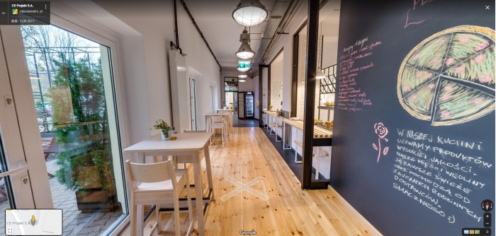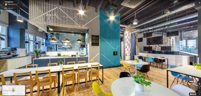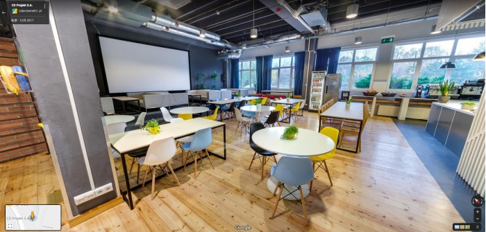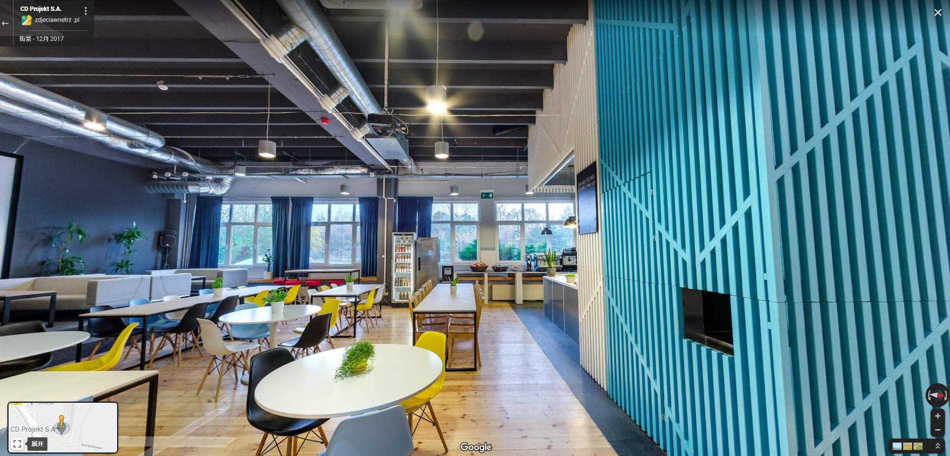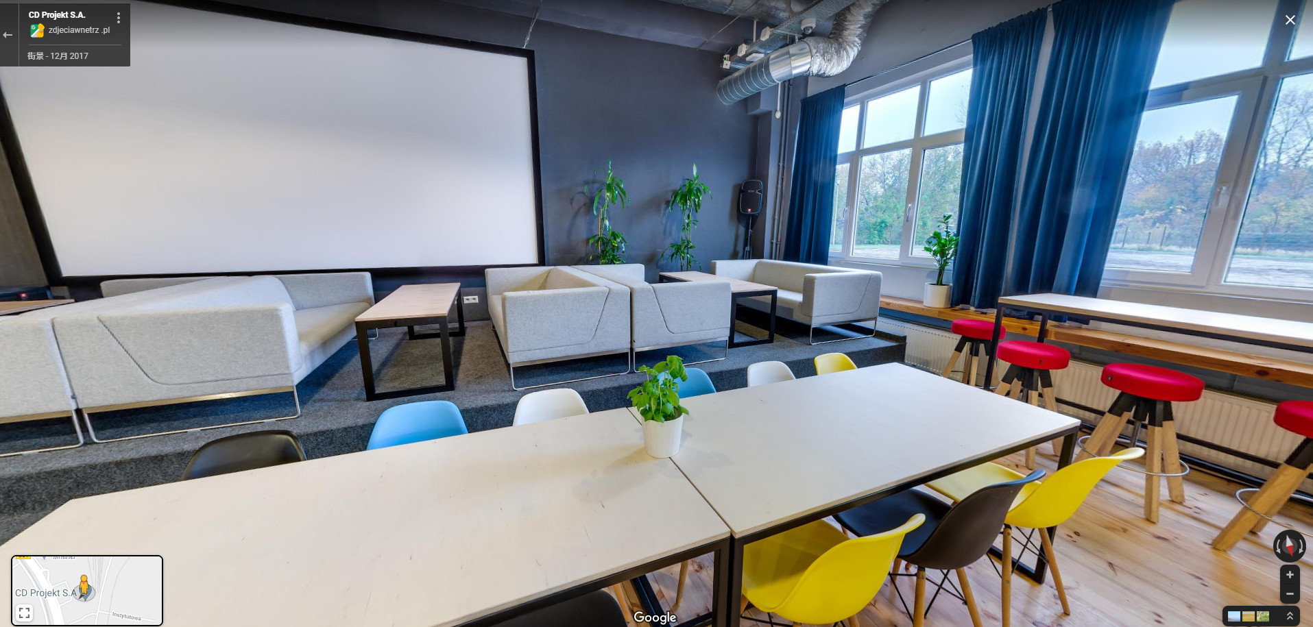 通过谷歌地图,你可以360度自由转动。点击提示的图标一步一步地向前“移动”,你可以进入CDPR的办公室,餐厅,健身区等等。