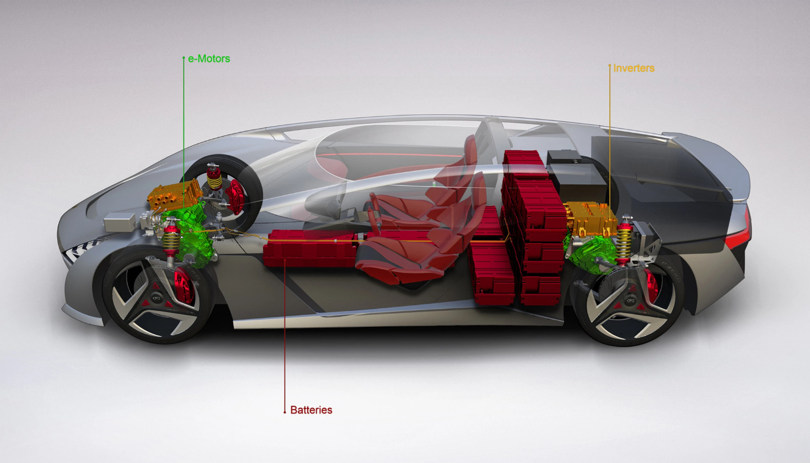 底盘是一个铝空间框架,电机和逆变器都安装在车轴上。跟典型的车底下电池不同的是,这种设计将两个电池盒放置在汽车的中间、两个座位之间,其余的则堆在座位后面,从而将大部分电池都安置在汽车的中心后方。