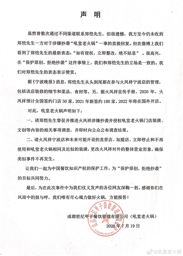 随后吼堂老火锅官方发布二度声明,表示虽然曾数次通过不同渠道联系郑恺先生,但很遗憾至今仍未收到郑恺先生一方对于涉嫌抄袭“吼堂老火锅”一事的直接回复。