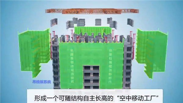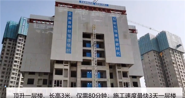 据了解,这台“住宅造楼机” 80分钟顶升3米,最快3天造一层楼,而且极具智能化,大量减少了人工操作,只需要1名管理人员在控制室内一键启动,五六个工人做好安全巡视即可。