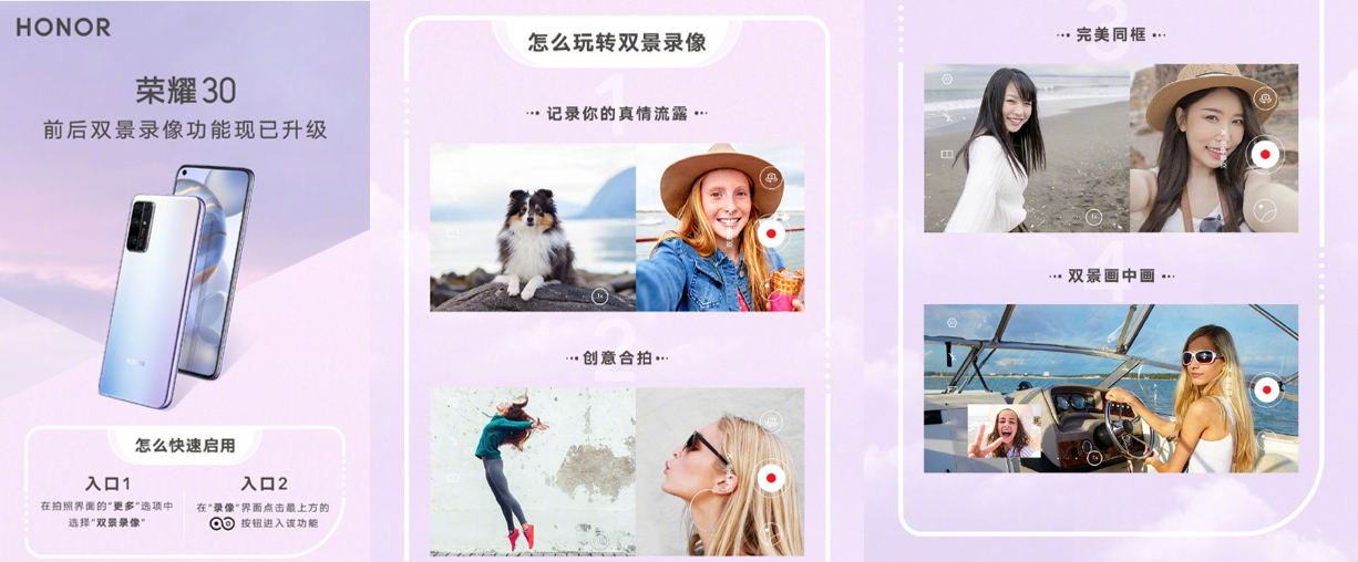 荣耀30系列不仅拍摄性能优秀,还持续进行系统更新,进一步获得更多拍摄新功能。此前新增了AI精彩瞬间功能,近期荣耀30又更新了双景录像功能。
