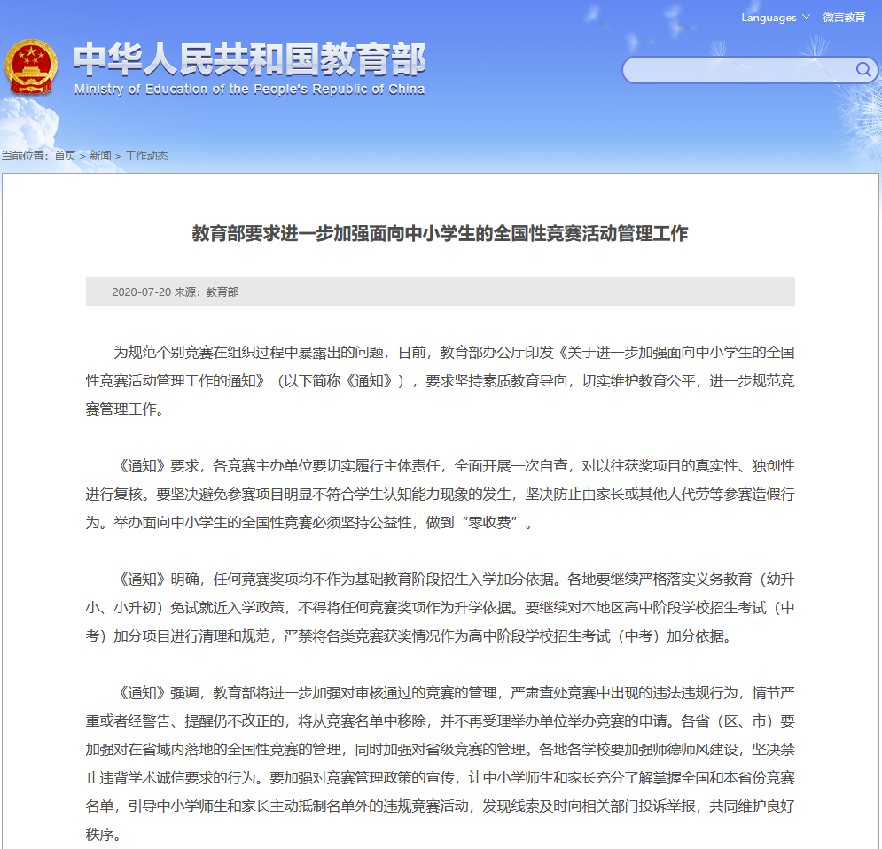 为规范个别竞赛在组织过程中暴露出的问题,日前,教育部办公厅印发《关于进一步加强面向中小学生的全国性竞赛活动管理工作的通知》(以下简称《通知》),要求坚持素质教育导向,切实维护教育公平,进一步规范竞赛管理工作。