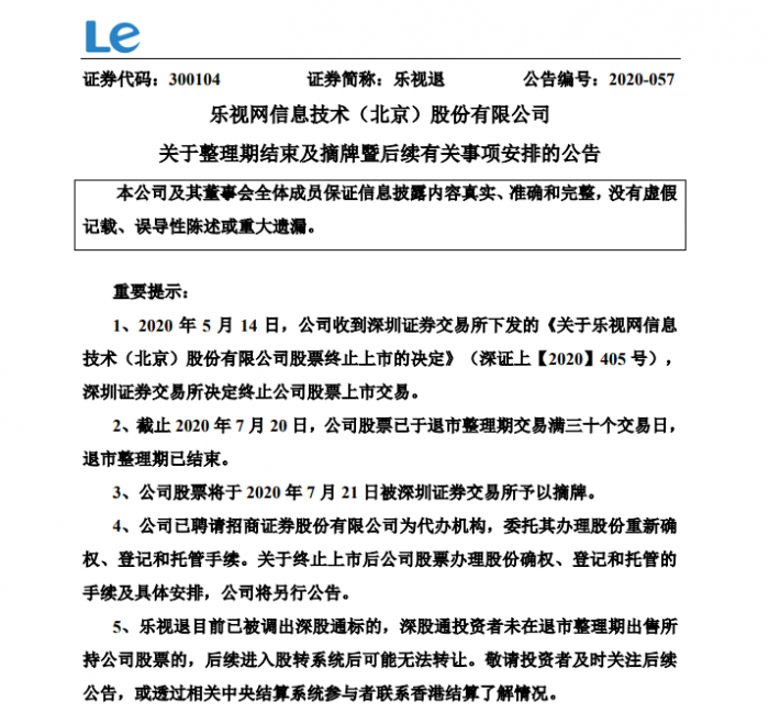 截止7月20日,乐视网公司股票已于退市整理期交易满30个交易日,退市整理期已结束,股票将于7月21日被深交所予以摘牌。