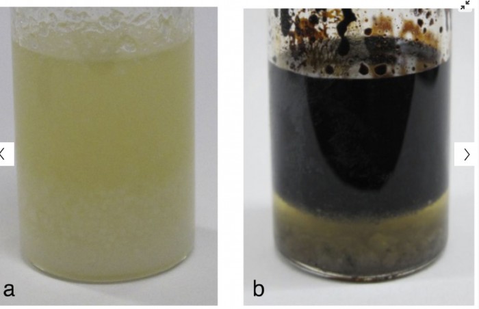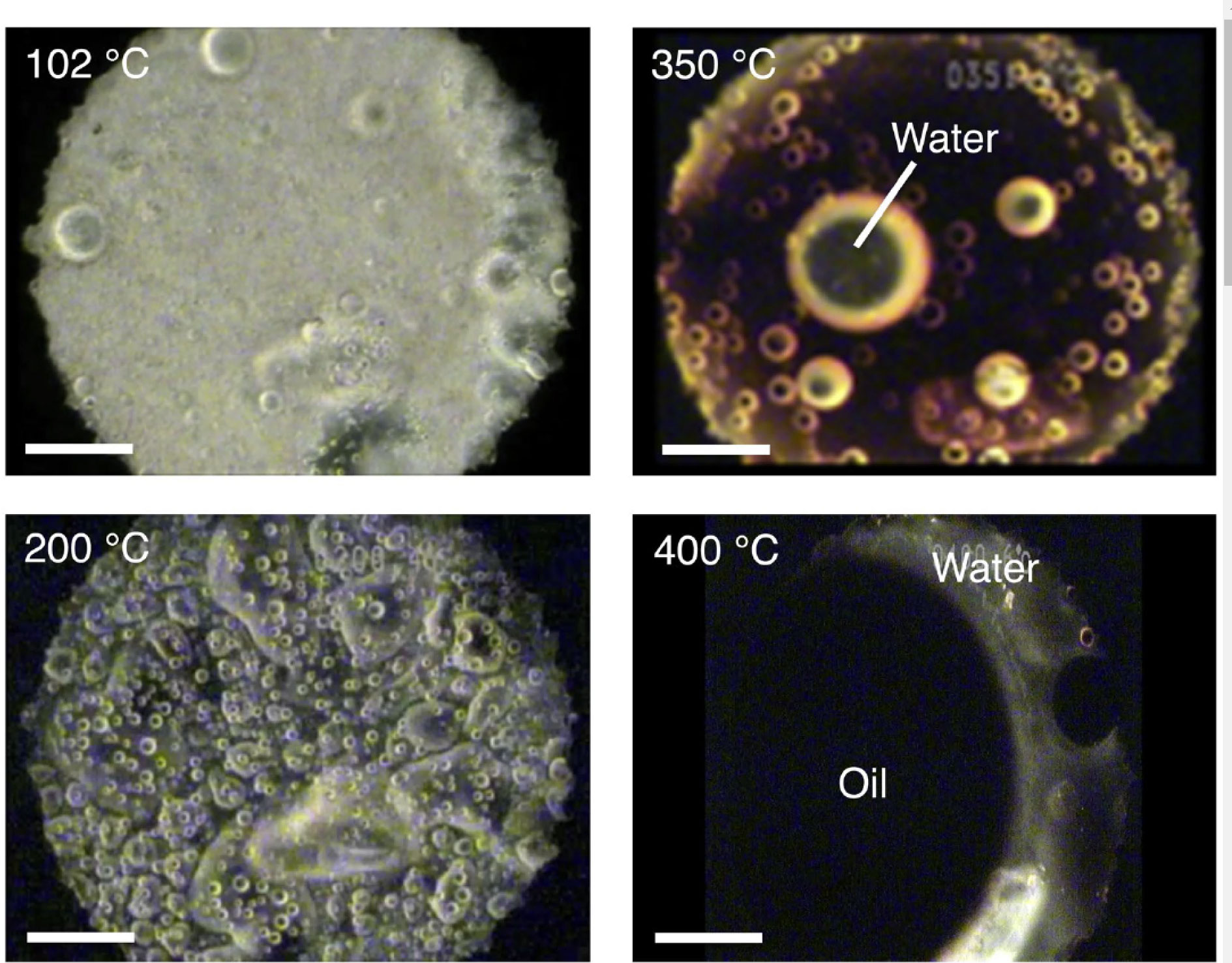 为了测试这个想法,研究小组制作了一个星际分子云中有机物的模拟版本。这种模拟物是一种富含一氧化碳、氨和水冰的混合物。然后,研究人员将它暴露在预计会遇到的各种条件下。研究小组将有机物加热到400℃(752°F),同时使用金刚石砧柱施加压力。样品在100 °C (212 °F)时保持得很好,但当温度达到200 °C (392 °F)时,它已经开始分离成两相:水和油。在 350 °C (662 °F)时,水开始冒泡变成更大的液滴。而在400 °C时,也产生了黑色的油,发现它的化学性质与地球内部发现的原油相似。