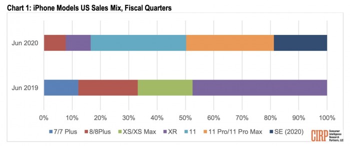 上一季度苹果在美国销售的智能手机中,iPhone 11、11 Pro和11 Pro Max合并占据了65%的份额,4月中旬上市的iPhone SE取代了iPhone XR、8和7的大部分销量,迅速在销量上占据一定份额。iPhone SE的价格为399美元,是苹果长期以来最便宜的智能手机,尽管有人批评它的设计老化,但它还是吸引了相当多的消费者。