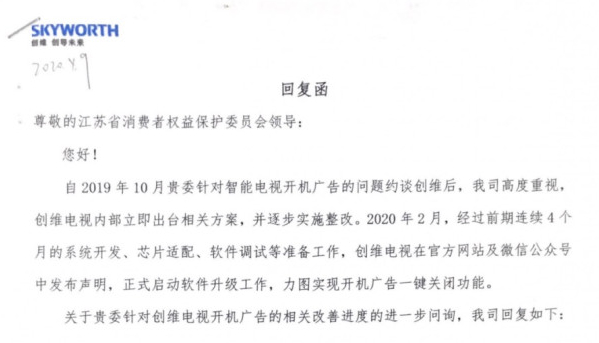 在2019年下半年,江苏省消保委针对智能电视开机广告侵犯消费者权益问题开展系列专项行动,要求创维、海尔、海信、夏普、小米、长虹、乐视七家企业限时整改。