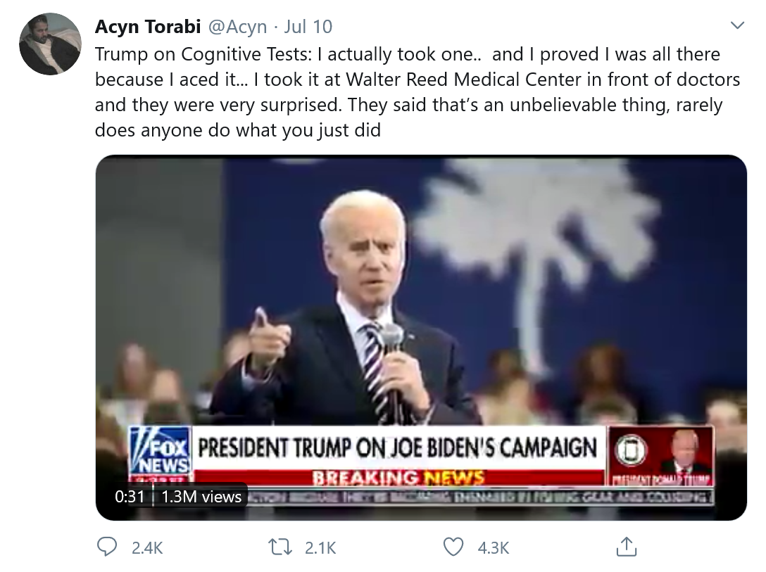 据外媒报道,本周末,特朗普总统接受了Fox News Sunday的Chris Wallace的采访,该场采访涉及了从新冠病毒测试到他的竞选集会等常见的问题,此外其还转向了一个极具新闻制造价值的话题。在一个视频中,特朗普吹嘘自己在认知测试中取得了“优秀”的成绩。