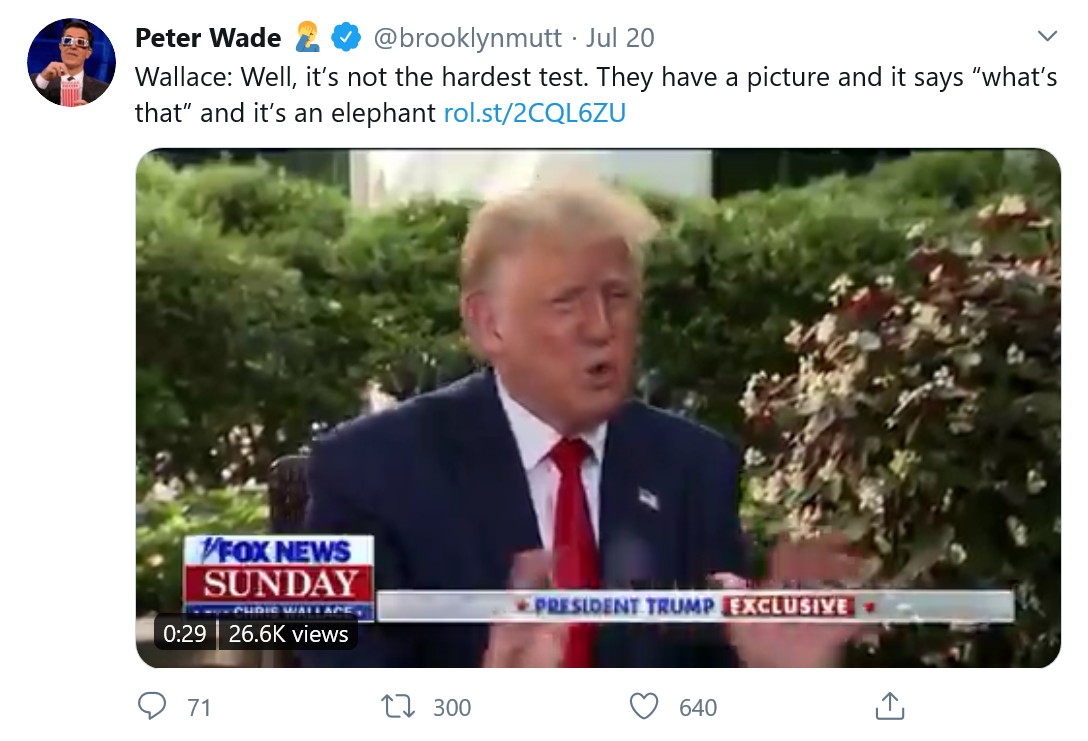在采访中,特朗普一度猜测Wallace的考试成绩可能不如特朗普。对此,Wallace回答称,事实上,他在网上找到了这个测试并参加了。这显然不需要特朗普暗示的那种非凡的智力才能完成,因为Wallace告诉总统,其中一个问题是让你识别动物的图片。