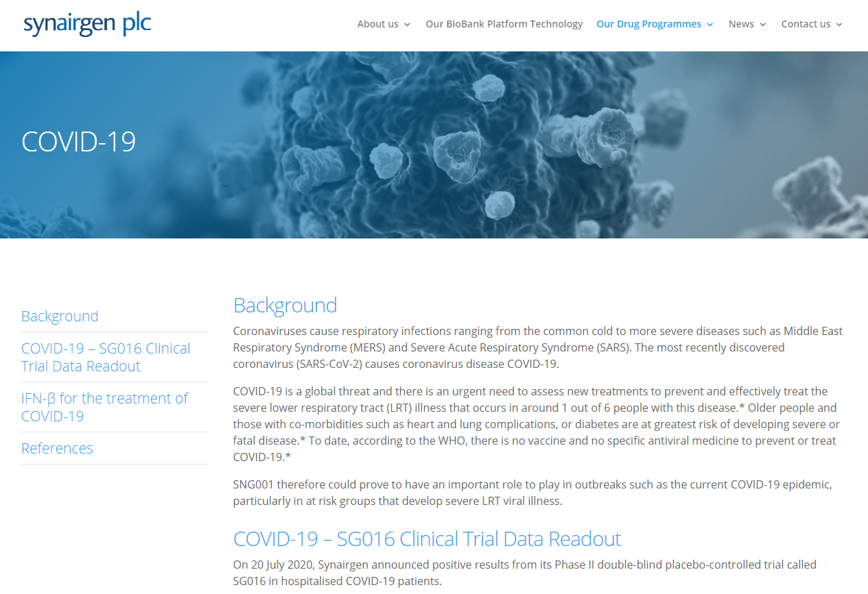 Synairgen公司的研究人员表示,将干扰素β气雾剂直接吸入患者肺部,可使COVID-19患者出现并发症的几率降低79%。据BBC报道,该公司表示,接受干扰素的患者恢复到疾病不会影响日常活动的可能性增加了两到三倍。该研究还显示,接受治疗的患者呼吸困难的情况“非常显著”地减少。最后,患者平均住院时间减少了三分之一,从9天减少到6天。