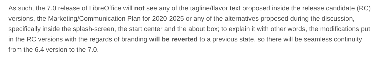 TDF 指出,LibreOffice 7.0 版本不会出现 RC 中出现的任何标语/变体文字,也不会看到 2020-2025 年市场营销计划或讨论中的任何替代方案。启动画面、启动中心和“关于”框都不会出现。也就是说,RC 版本中对标识的修改将被恢复到以往的状态。