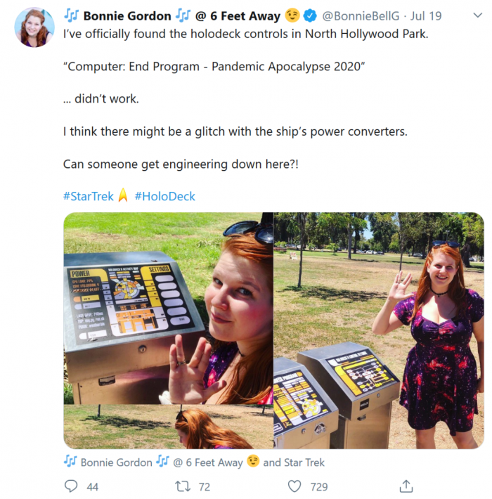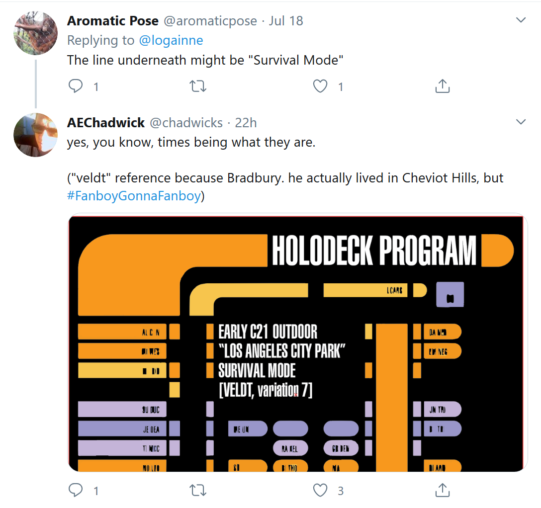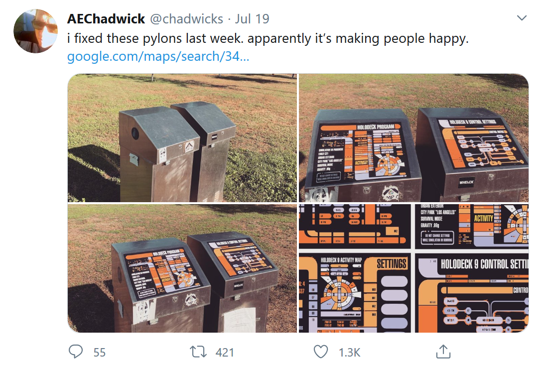 周日,Chadwick在Twitter上发了一些这个全息甲板的照片,“我上周修好了这些塔,”他写道,“显然,这让人们感到快乐。”