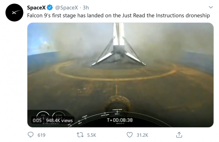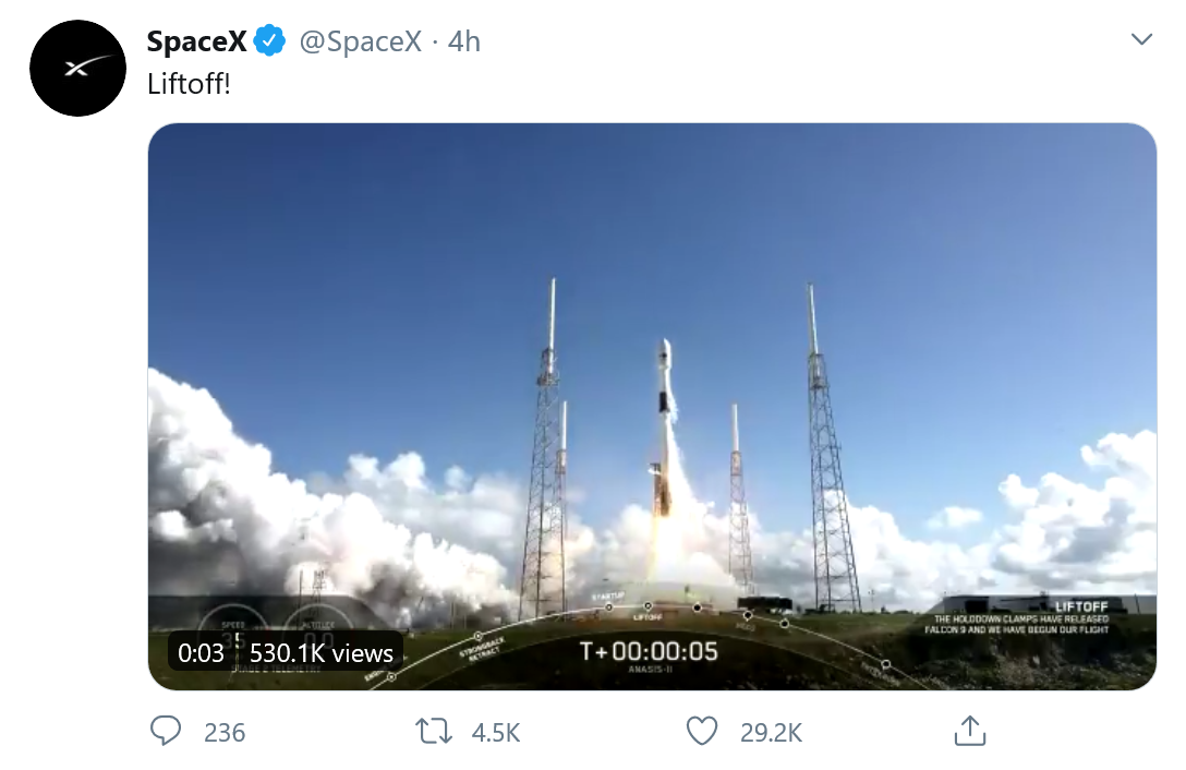 Anasis-II在升空约32分钟后部署。按照客户的要求,SpaceX没有在网络直播中直播卫星的部署,但在直播频道上提供了口头确认。