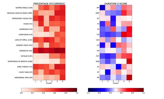 在套上机器学习算法之后,研究团队对 14 中症状进行了观察,最终确定了 6 组不同的 COVID-19 患者,从而推断有哪些可提供较高预测准确性的指征。