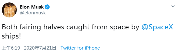 虽然没有分享整流罩的实际回收画面,但伊隆·马斯克还是很激动地在 Twitter 上宣布了此事。