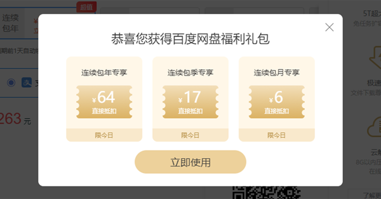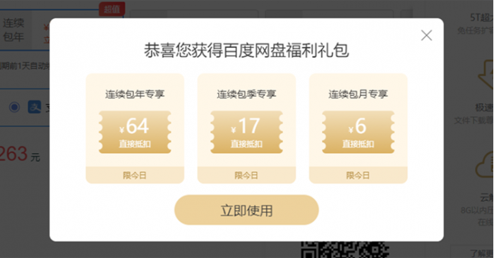 注:连续包年199元是打开百度网盘超级会员弹出领取64元优惠券后得来的,有的用户打开可能不会出现优惠券。