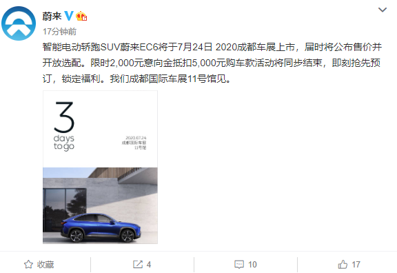 今日,蔚来官方宣布,旗下首款智能电动轿跑SUV蔚来EC6将于7月24日 2020成都车展上市,届时将公布售价并开放选配。目前,EC6已经开启限时2000元意向金抵扣5000元购车预订,届时该活动将同步结束。