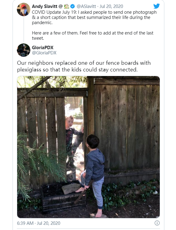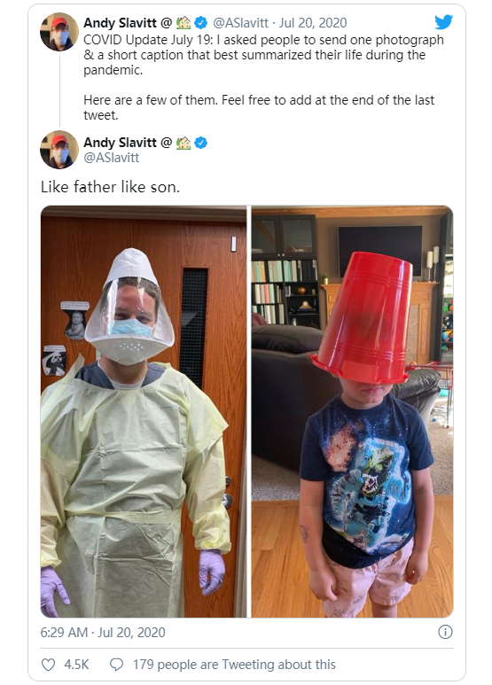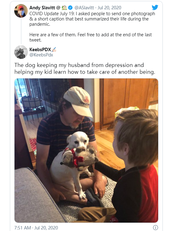 前奥巴马政府公共卫生专家安迪·斯拉维特(@ASlavitt)在Twitter上拥有超过53.9万名粉丝,他最近发出呼吁,要求人们给他发一张照片以及一个“最能概括他们在大流行期间的生活”的标题。