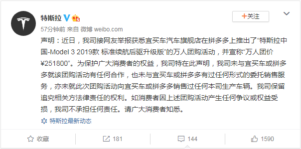 据网友爆料,近日,宜买车汽车旗舰店在拼多多上推出了“特斯拉中国-Model 3 2019款 标准续航后驱升级版”的万人团购活动,并宣称“万人团价¥251800”。特斯拉今日对此发表声明称, 未与宜买车或拼多多就该团购活动有任何合作,也未与宜买车或拼多多有过任何形式的委托销售服务,亦未就此次团购活动向宜买车或拼多多销售过任何本司生产车辆。