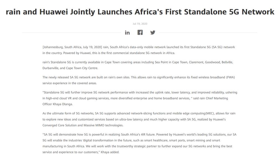 但Rain似乎没有被吓住,Dlanga表示将继续与作为其“值得信赖的战略合作伙伴”的华为合作,以进一步扩展其5G网络。