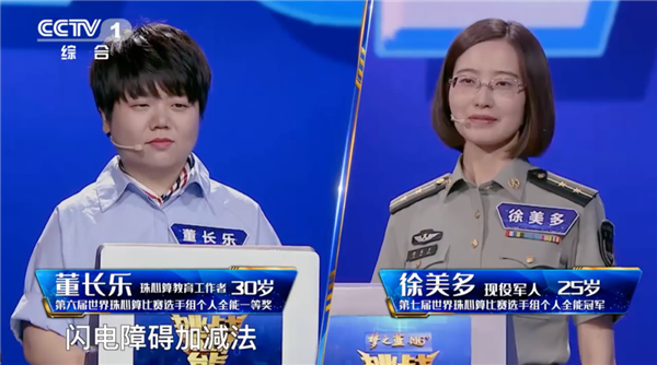 结果,30岁的珠心算教育工作者董长乐只用1.71秒就算出正确答案,获得了“珠心算挑战王”称号。