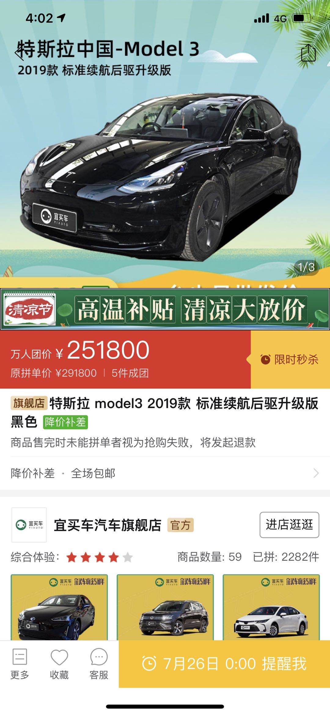 此前,拼多多平台上的宜买车汽车旗舰店上线了“特斯拉中国-Model 3 2019款 标准续航后驱升级版”的万人团购活动”,团购活动价251800元,比官方指导价 291800 元还便宜了4万元。