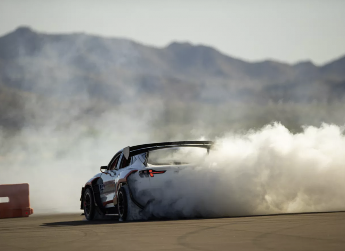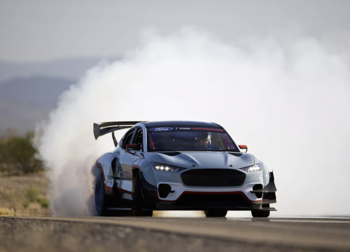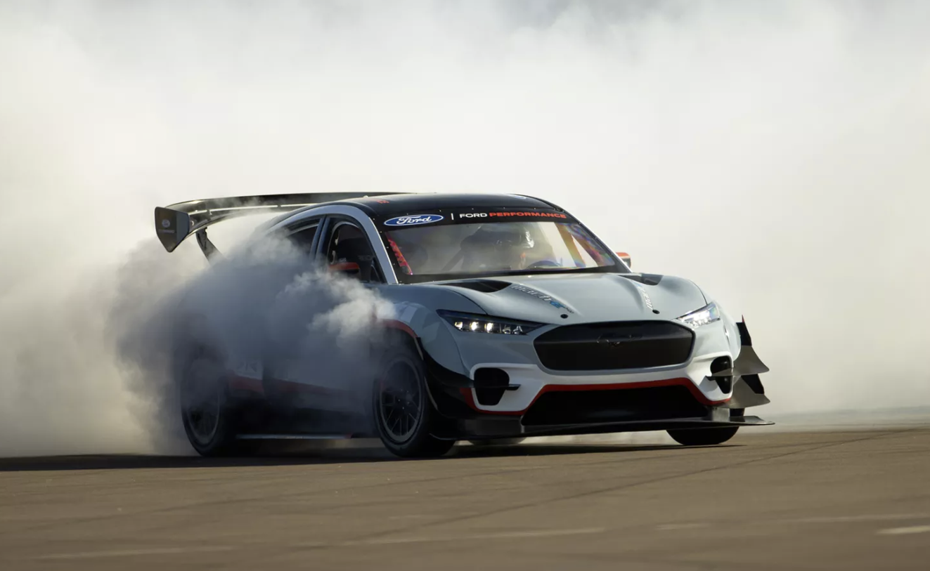 至于那些电动马达:4个驱动后轮,3个驱动前轮,所以这辆示范车可以用很多不同的方式提供动力。它可以在全轮驱动、后轮驱动或前轮驱动模式下运行,并可轻松调整为飙车、传统赛道驾驶或漂移。这款电动车在行驶时可以释放大量浓烟,这并不应该让人感到惊讶,因为福特性能公司在专业漂移者Vaughn Gittin Jr.的帮助下打造了野马Mach-E 1400。