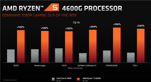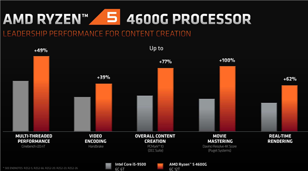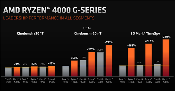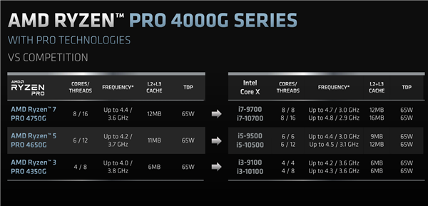 竞品对位方面,锐龙7/5/3 4000G系列分别正面对标九代和十代酷睿i7/i5/i3系列,在核心数量、主频、缓存容量、GPU水准、热设计功耗方面都毫不逊色,这也正是其能够赢得SI、OEM高度青睐,初期订单直接被抢光的根本原因。