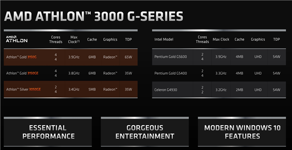 速龙部分有三款,速龙金牌3150G 4核心4线程,主频3.9GHz(不支持加速),二级缓存2MB,三级缓存4MB,集成Radeon GPU(具体规格未披露),热设计功耗65W。