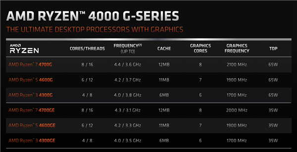 锐龙7 4700GE、锐龙5 4600GE、锐龙3 4300GE是对应的节能版型号,热设计功耗仅为35W,而规格牺牲非常小,CPU基准频率仅降低了300-500MHz,最高加速频率降低100MHz或者不变,GPU频率完全不变!