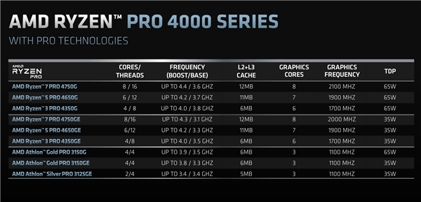 速龙PRO 4000G、速龙PRO 3000G系列也是9款,编号有所变化,但基本参数和非PRO版是一样的,具体来说分别是锐龙7 PRO 4750G/4750GE、锐龙5 PRO 4650G/4650GE、锐龙3 PRO 4350G/4350GE、速龙金牌PRO 3150G/3150GE、速龙银牌PRO 3125GE。