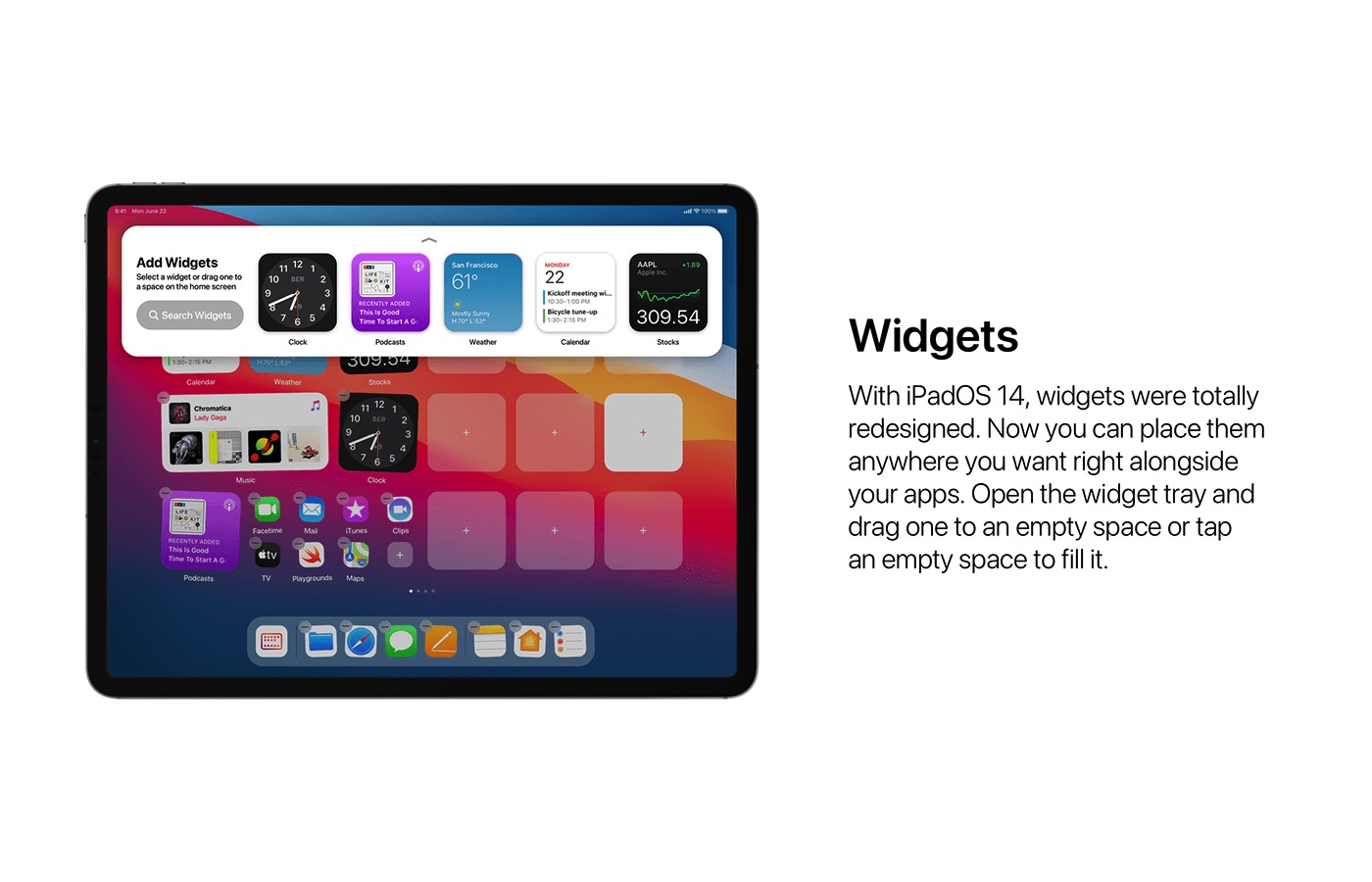 苹果为 iPhone 用户带来了全新的 iOS 14,小组件首次可以在主屏幕任意摆放,还有全新的 App Library 功能。不过在 iPadOS 14 上,小组件仍然不支持任意位置摆放。设计师 Parker Ortolani 分享了全新 iPadOS 15 概念设计,在 iPadOS 14 的基础上,增强了小组件体验。