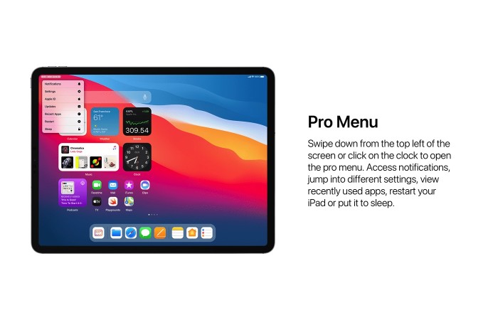 Parker Ortolani 的设计让应用和小组件都可以任意摆放,还有 App Library 功能。其他新鲜的设计包括 Pro Menu(专业菜单功能),可以快速访问某些系统功能,类似于 macOS 上的苹果按钮。最后,控制中心的设计也更类似于 macOS Big Sur,激活时不会占据整个屏幕。