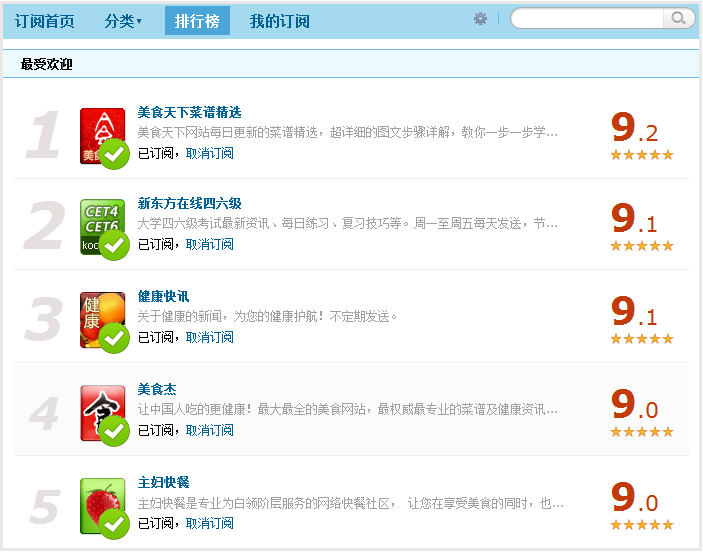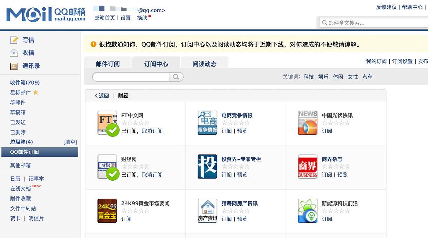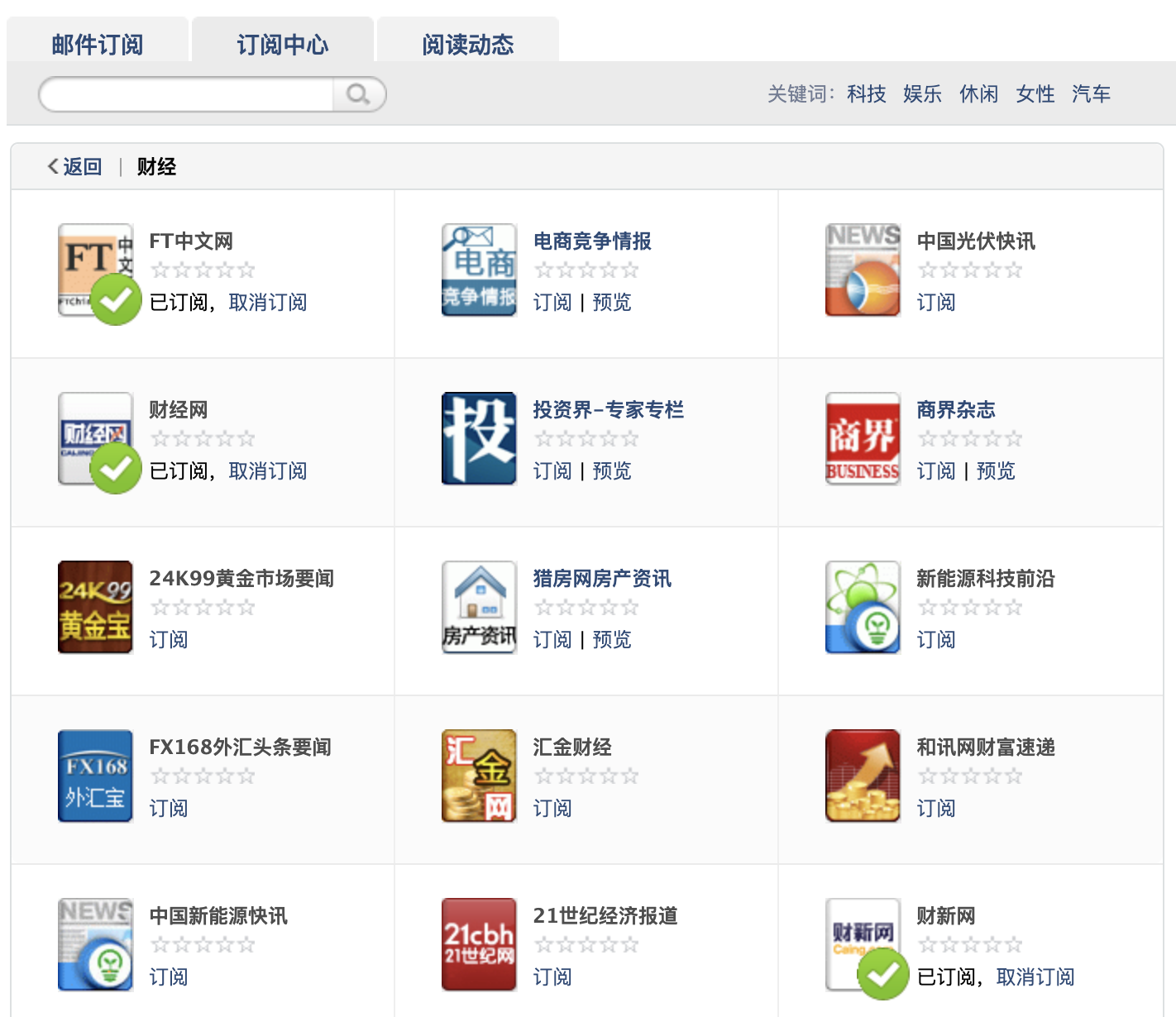 “邮件订阅”的定义是提供免费的杂志订阅服务,当然这里说的是电子杂志,这种理念和现在微信公众号的订阅-推送一致,也可以说是脱胎于 RSS 服务。不同的是,QQ 邮箱中是有“订阅中心”的,里面提供了不同领域的优秀栏目,排行榜中有对栏目的评分、分类标签、用户评论、同类推荐。