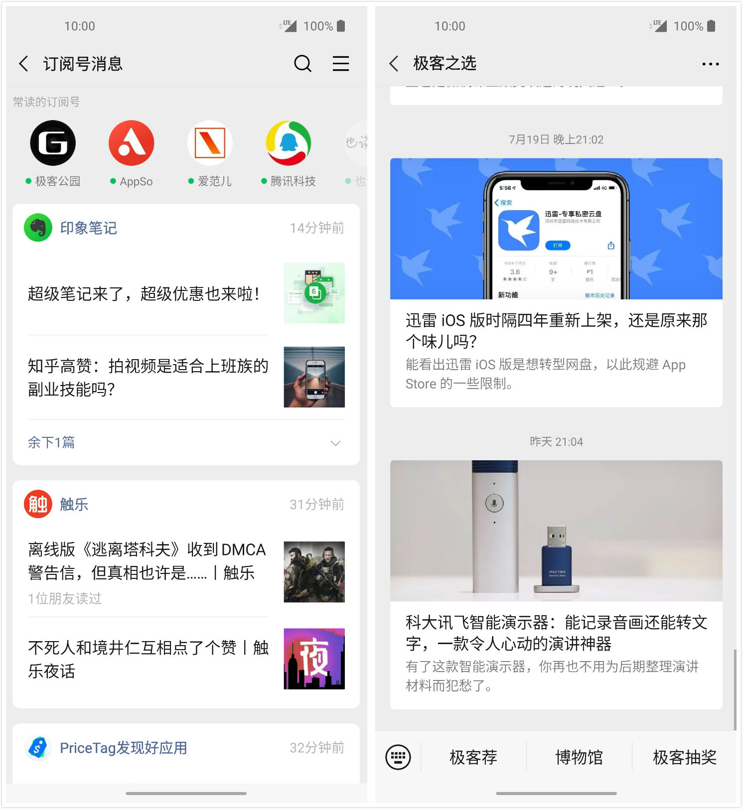 这些都与现在的公众号相似,大部分账号每天可推送一次,数量最多 8 篇,长时间未更新的号会沉在下面,而订阅号助手的推出,则是让短内容的发送更方便,让创作者推送文章的门槛更低,主要是“贵在坚持”。
