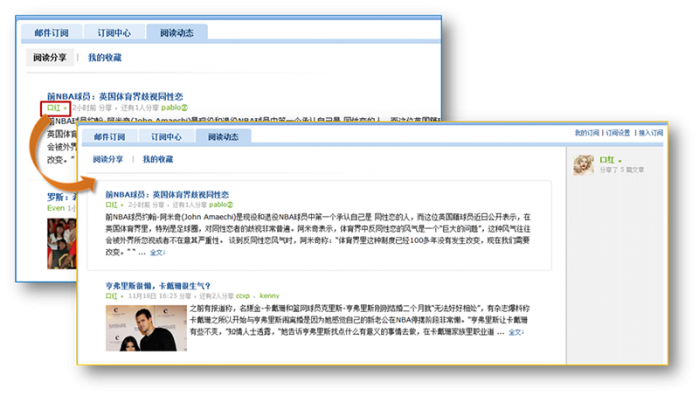虽然功能嫁接于邮箱产品上,但邮件订阅很早就支持收藏和评论,阅读动态中是别人分享的文章,类似现在的朋友圈,从传播角度上远高于单纯的个人订阅。