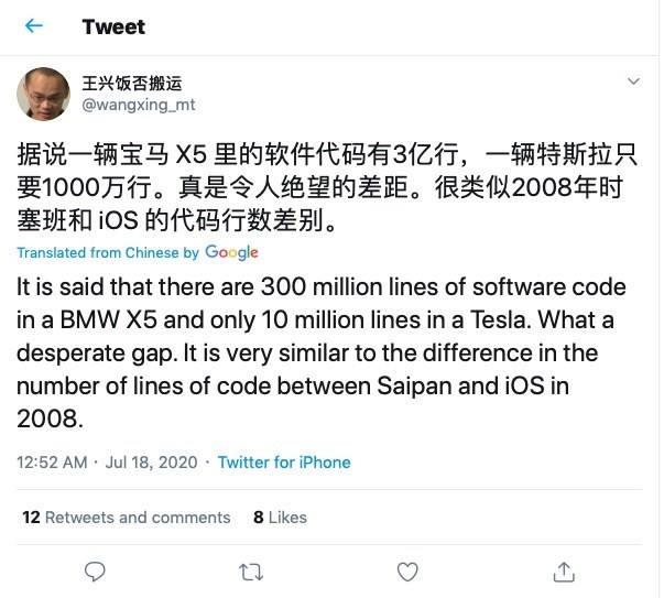 在互联网大佬圈中,美团的王兴无疑是发言最积极踊跃的一位。近日,美团CEO王兴在个人的社交媒体@王兴饭否搬运发表的言论,又引起了网友的关注与讨论。王兴称,“据说一辆宝马X5里的软件代码有3亿行,一辆特斯拉只要1000万行,真是令人绝望的差距。很类似2008年时塞班和iOS的代码行数差别。”两家公司竟然还能够这样比较,此话一出,也引发了网友的热议。