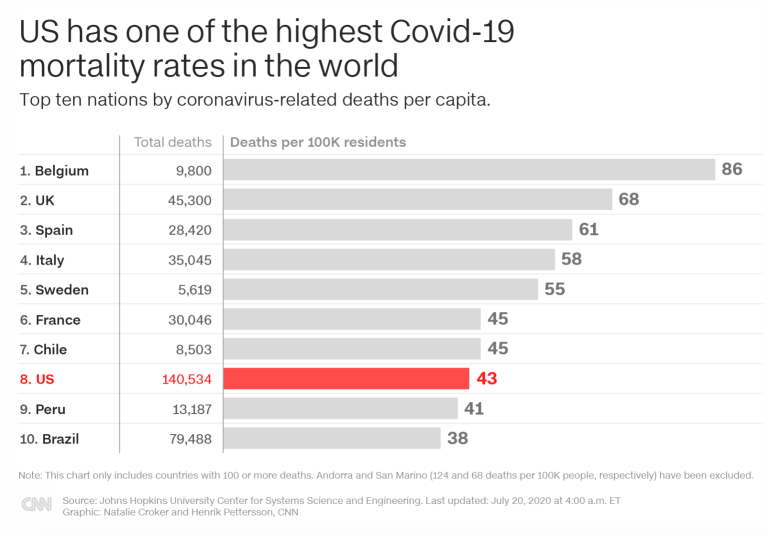 实际上,美国是新冠病毒死亡人数最多的国家之一。根据约翰斯-霍普金斯大学的数据,美国已经发现了近390万例冠状病毒病例,同时还有超过14万人死亡。根据CNN的报道,以下是美国的新冠死亡率。