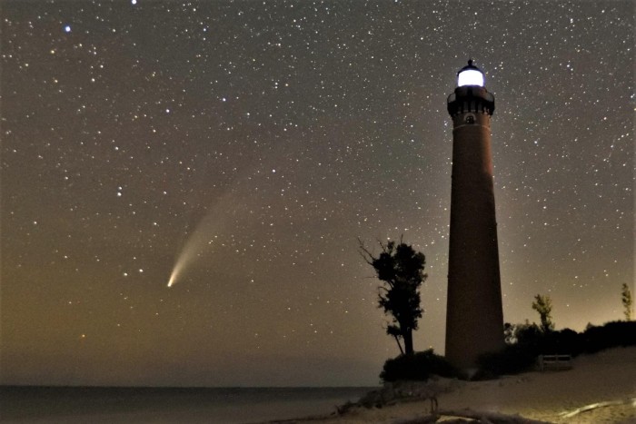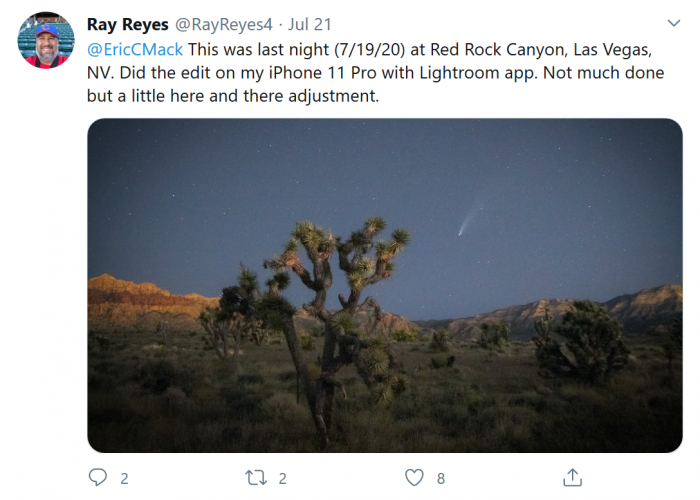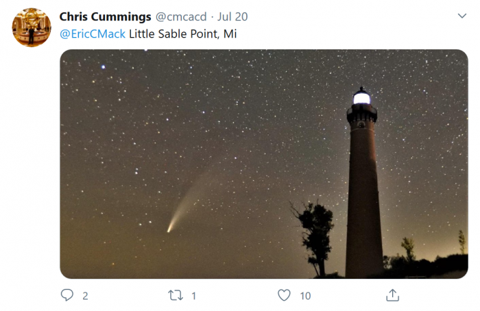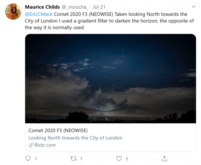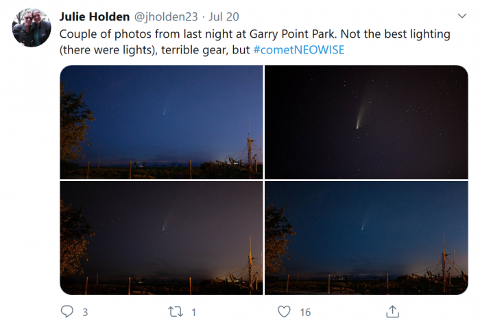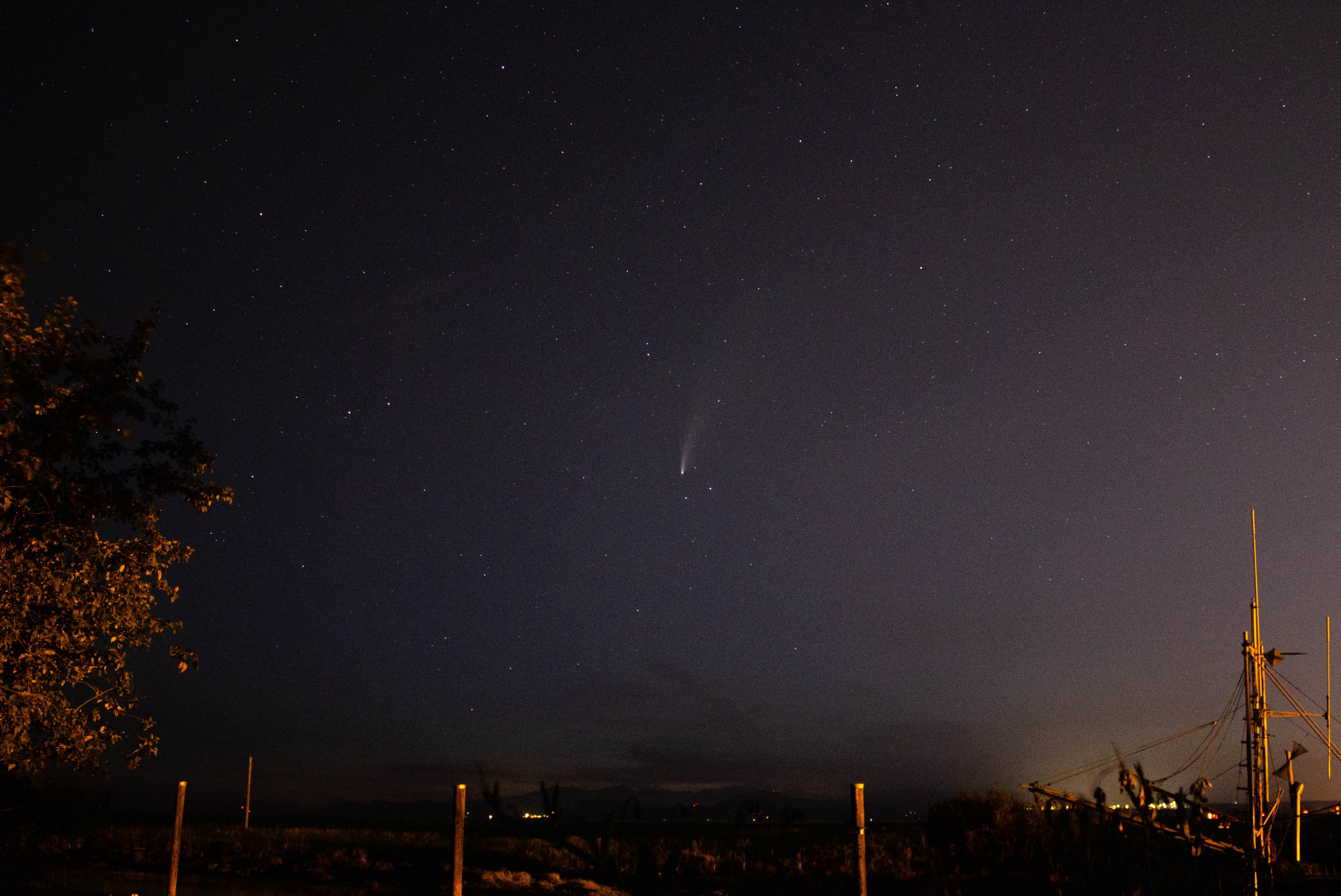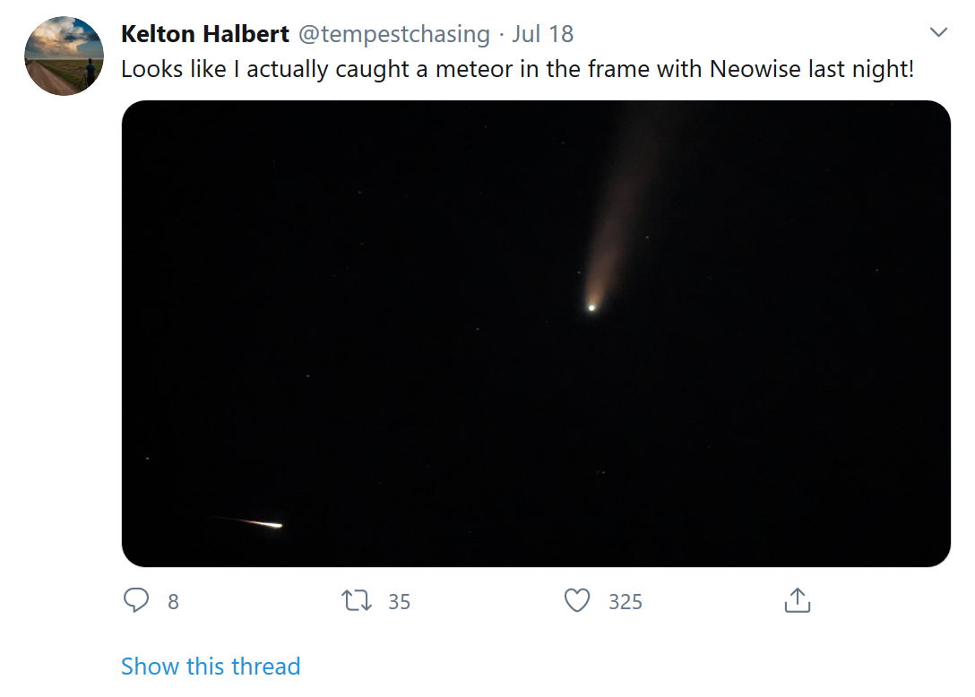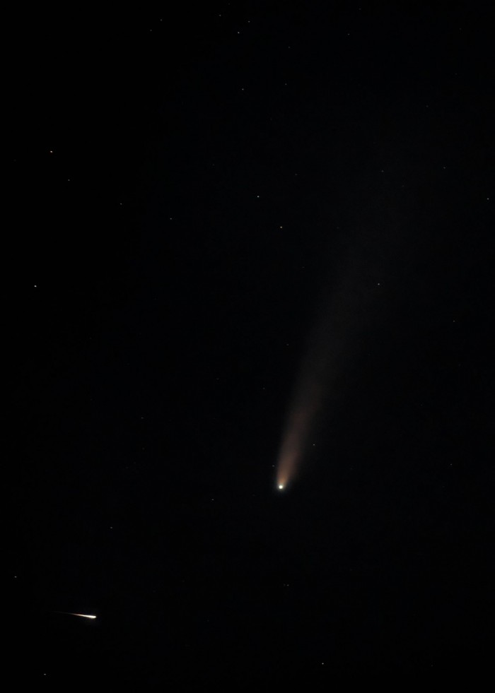 这位记者表示,当他的眼睛还没有完全适应黑暗之前,彗星Neowise和它那长长的尾巴就出现在他眼前。据其披露,他在不到10分钟的时间里就成功地看到了两颗流星略过,其中一颗似乎横切在Neowise的尾巴处。不过遗憾的是,他没有立刻拿出望远镜进行更详细的观赏或相机拍下这一幕。