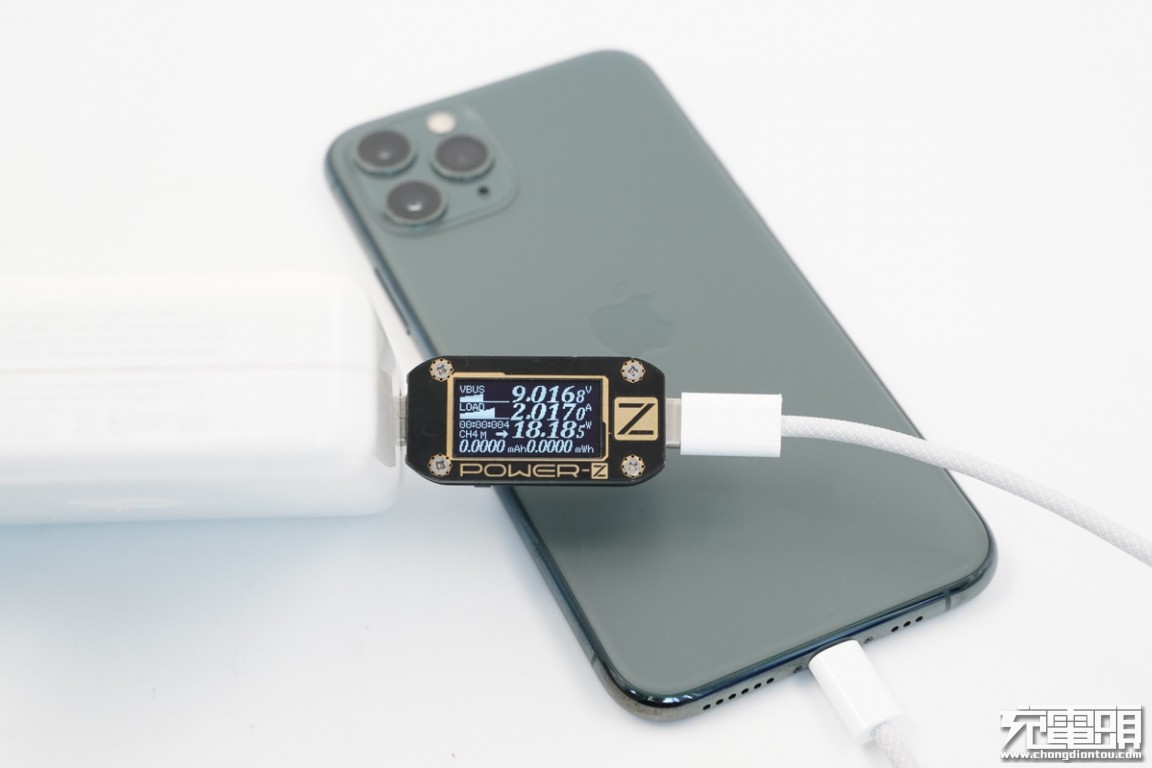 iPhone 11 Pro支持USB PD/Apple2.4A快充协议,使用线材搭配PD充电器为iPhone 11 Pro充电,功率为9.01V 2.01A 18.18W,成功握手9V电压档位,开启PD快速充电模式。