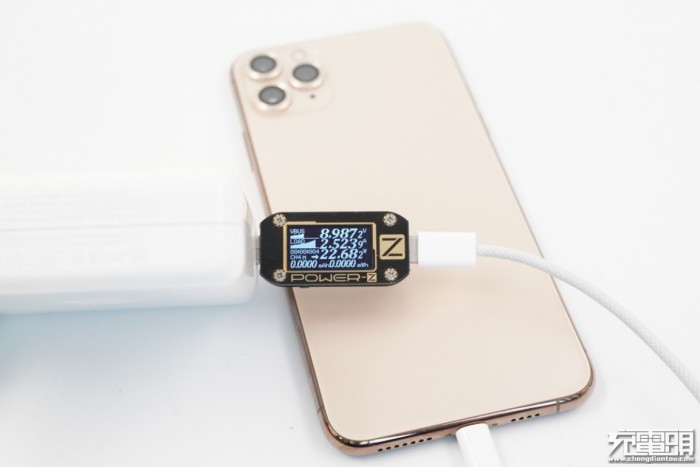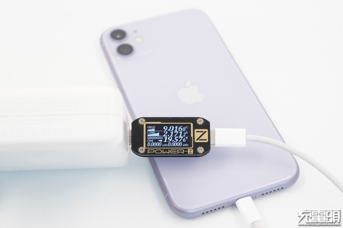 iPhone 11支持USB PD/Apple2.4A快充协议,使用线材搭配PD充电器为iPhone 11充电,功率为9.01V 2.17A 19.57W,成功握手9V电压档位,开启PD快速充电模式。