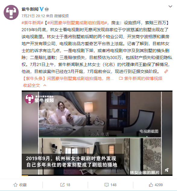 女子看电视剧时,无意中发现自己多年未住的别墅成剧组拍摄地,这样的桥段本应该出现在电视中出现。然而让人没有想到,这样奇葩的事情却实实在在地发生了。近日,据国内媒体报道,2019年9月底,林女士看电视剧时无意间发现自家位于宁波慈溪的别墅出现在了电视剧里。