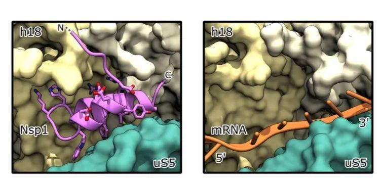 在所有的生物细胞中,合成蛋白质的任务都是由核糖体的复杂分子机器来完成的。核糖体与信使核糖核酸相互作用,信使核糖核酸是蛋白质合成的蓝图,并将每个信使核糖核酸序列转化为相应蛋白质的氨基酸序列。氨基酸序列又决定了每种蛋白质的形状和生物功能。核糖体由两个不同的亚基组成,Nsp1与较小的一个40S亚基结合。mRNA最初与小亚基结合,然后后者与60S亚基相互作用形成空腔,然后mRNA从中穿过。新的研究表明Nsp1蛋白的一端与40S亚单位相互作用,阻止了mRNA的结合。