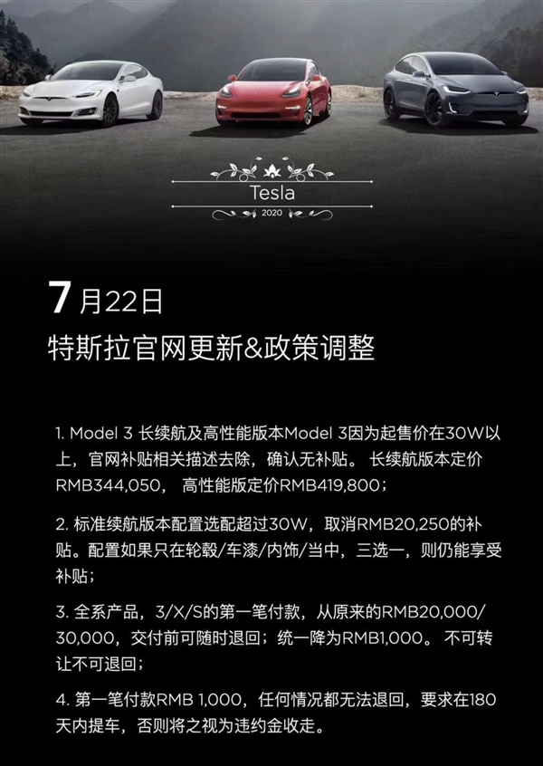 此外,特斯拉还对旗下全系车型的预定政策进行调整。如今消费者只需提交1000元定金(此前需要缴纳20000元订金,可以退还),即可预定车辆,但该定金不可退还不可转让,且需要在180天内提车。