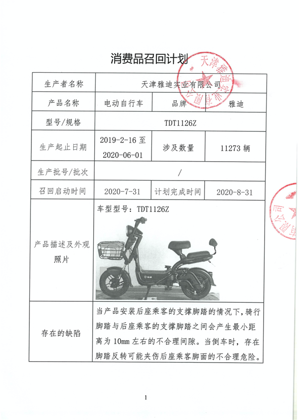 据雅迪电动车官网消息:天津雅迪实业有限公司决定,将召回2019年2月至2020年6月期间制造的“雅迪牌TDT1126Z型”电动自行车,涉及数量为11273辆。据悉,本次召回的TDT1126Z型电动自行车,是由于骑行脚踏与后座乘客的支撑脚踏之间存在10mm左右的不合理间隙,倒车时脚踏随动反转,可能存在夹伤后座乘客脚面的安全隐患。